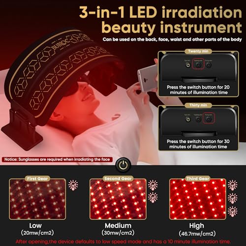 Easy to use: The infrared belt will also be fixed on the use site with a fixed strap, or inserted into a fixed base, lie flat on the bed, adjust the red light to the target area, select the gear, and it is simple to use. It is strongly recommended to adjust the red light band according to the skin condition, and It is strongly recommended to use it 3-5 times a week. Wear the included sunglasses to avoid eye discomfort when the usage of it on your face.