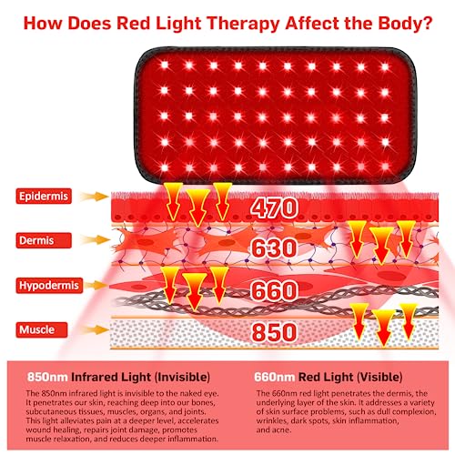 DUAL SPECTRUM TECH: Red light is recognized as a healthy and safe therapy, 660 nm red light (visible light) acts on the epidermis to improve skin appearance, accelerate healing after sports injuries.850 nm near infrared light (invisible light) penetrates deep into tissue cells to help relieve pain and increase blood circulation, reduce inflammation and joint pain, relieve muscle tension, promote cell regeneration.