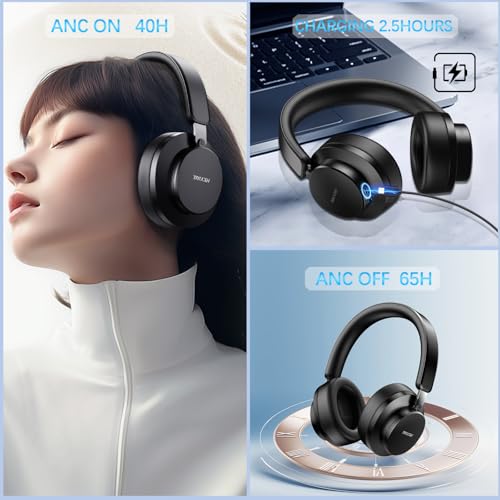 Over Ear Headphones Wireless Bluetooth, Noise Cancelling Headphones Bluetooth with Microphone, Cancelling Wireless Headphones Over Ear, 65h Playtime, Clear Calls, Comfort Fit For Travel (Black)