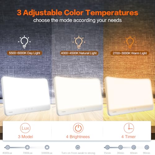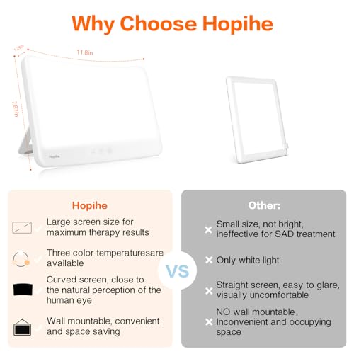 Specification: Hopihe Light Therapy Lamp UV-Free 10000 Lux Sun Lamp with Wall Mountable, 3 Color, 5 Brightness, 4 Timing and Memory Function, Touch Control Sunlight Lamp, Large Light Therapy Box for Home/Office