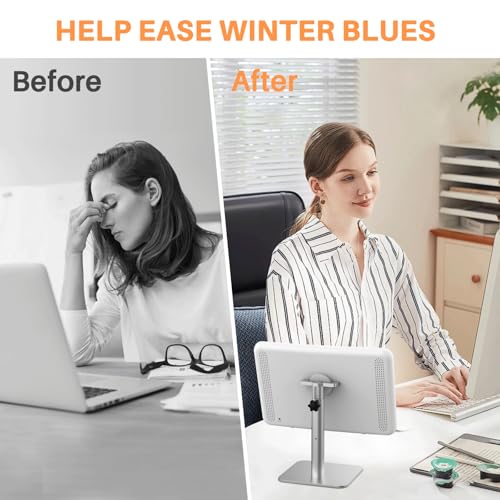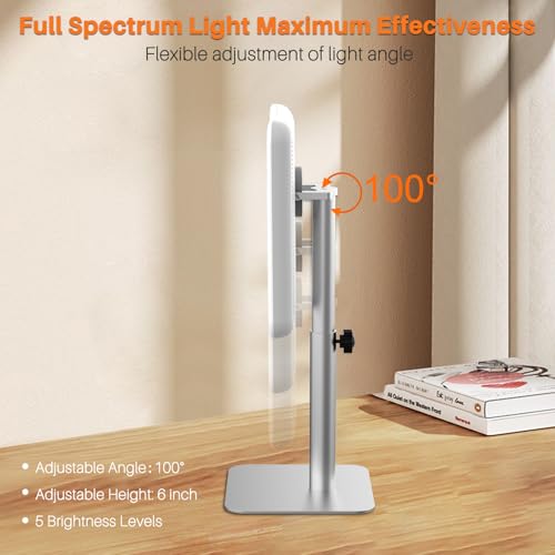 Adjustable Stand for Optimal Light Exposure: Features a height-adjustable stand that may be raised or lowered to 5.7 inch and tilted up to 100°, allowing you to customize the light’s angle and height for top-of-the-line light therapy.