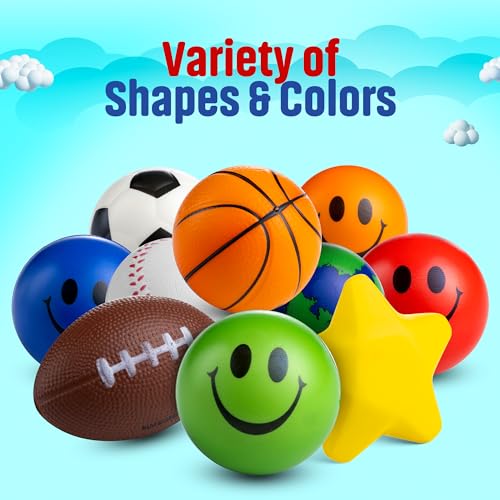 Specification: Bulk Mini Stress Balls for Kids (25 Pack) 2-3 Inch Soft Squeezable Squishy Fidget Toys Balls, Variety of Shapes & Colors, for Kids Party Favors & Goody Bag Stuffers, Birthday Gifts for Boys & Girls