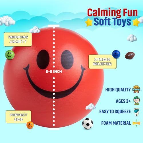 CALMING FUN SENSORY TOYS: This assortment of 2-inch stress balls for kids is made of soft foam, very fun to squeeze, fidget with at any age and the perfect size to fit in little hands. Stress balls help in lowering levels of stress and tension that can help to improve you and your kids’ quality of life