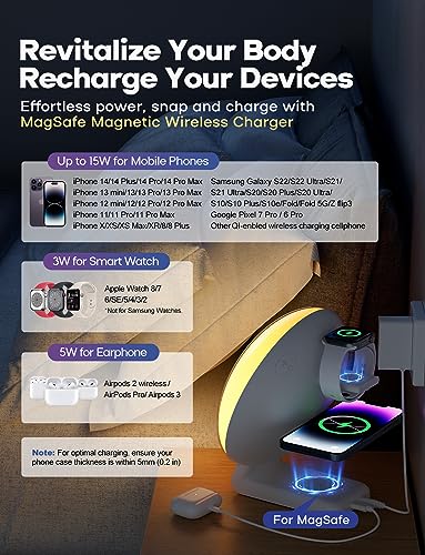 【Comprehensive Wireless Charging Solution for You and Your Devices】: As you recharge at night, so can your devices. Dekala Wireless Charging Sunrise Alarm Clock serves as an all-in-one charging station. It supports wireless charging work for MagSafe iPhone 14/13/12/11/X Series for Apple Watch SE/8/7/6/5/4/3/2 for AirPods 3/2/Pro Compatibilwith Samsung Galaxy S23/S22/S21/S20/Note 20/Note 10.Not enhance Samsung Watch and iWatch 1.